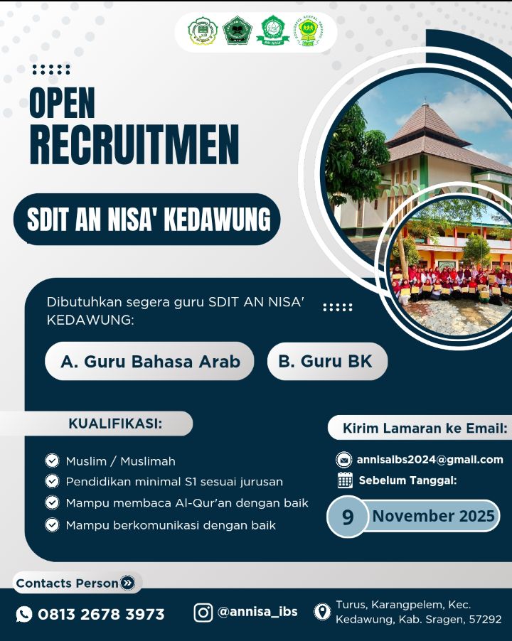 SDIT AN NISA' KEDAWUNGDibutuhkan segera guru SDIT AN NISA' KEDAWUNG:A....
