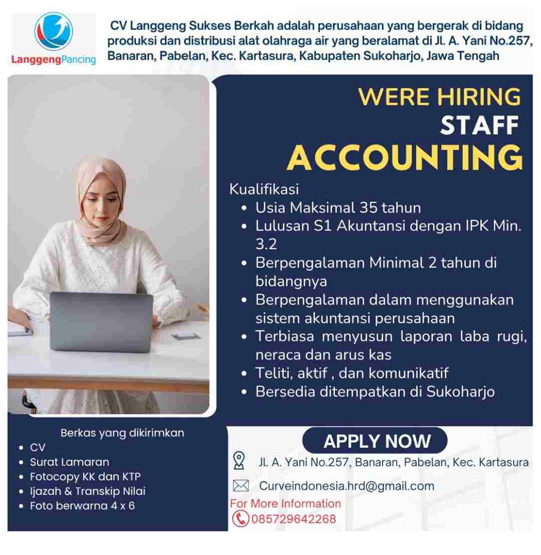 HIRING STAFF ACCOUNTINGKualifikasi :Usia Maksimal 35 tahunLulusan S1 Akuntansi dengan IPK Min. 3.2Be...
