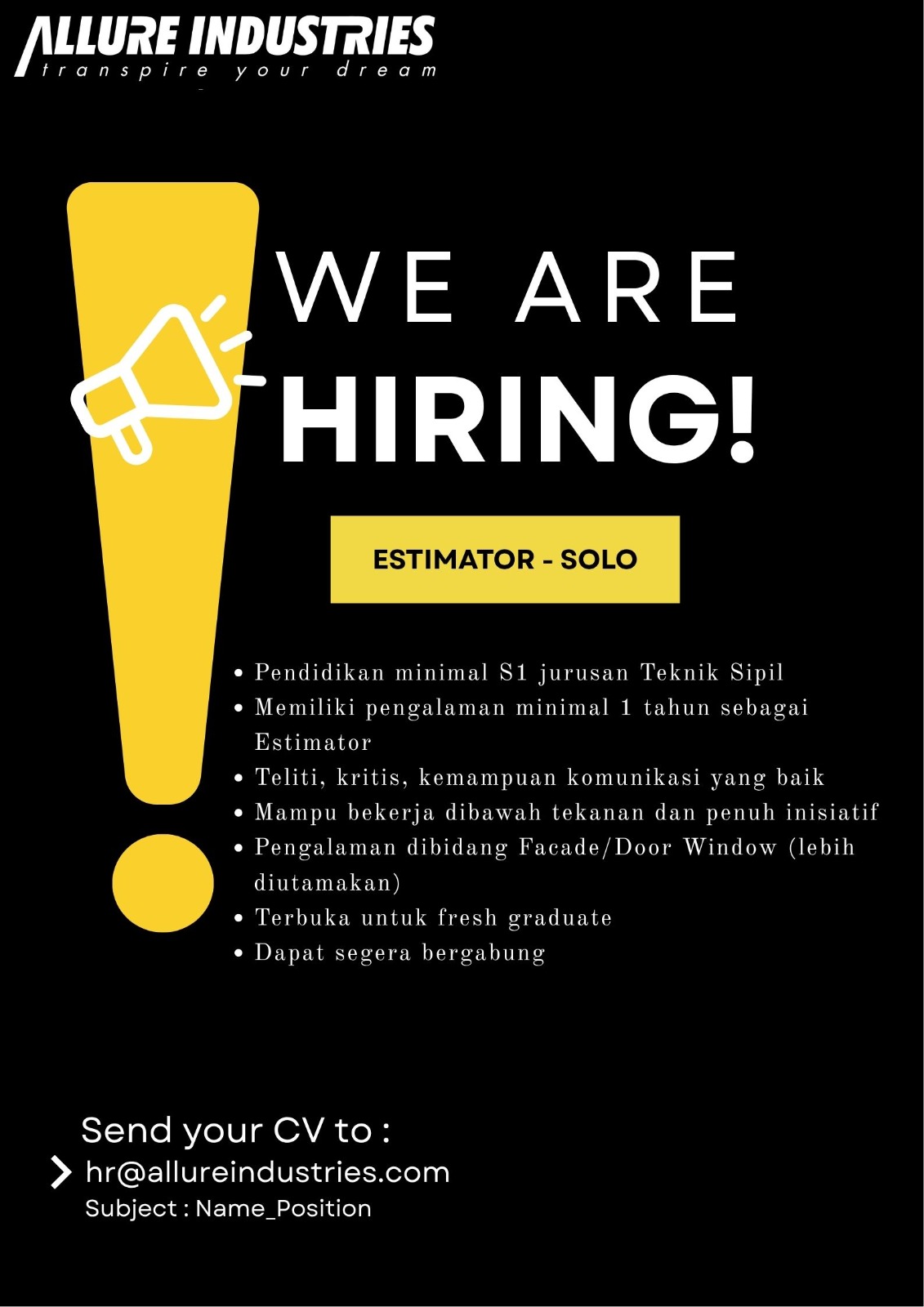 HIRING !!!!Pendidikan minimal S1 jurusan Teknik SipilMemiliki pengalaman minimal 1 tahun sebagai Est...