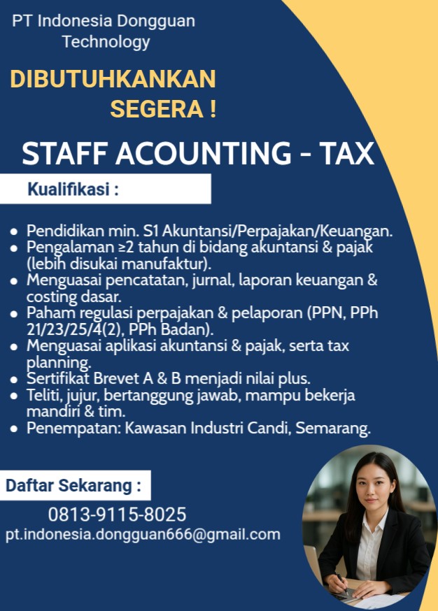 PT Indonesia Dongguan TechnologySTAFF ACOUNTING – TAXKualifikasi :Pendidikan min. S1 Akuntansi/Per...