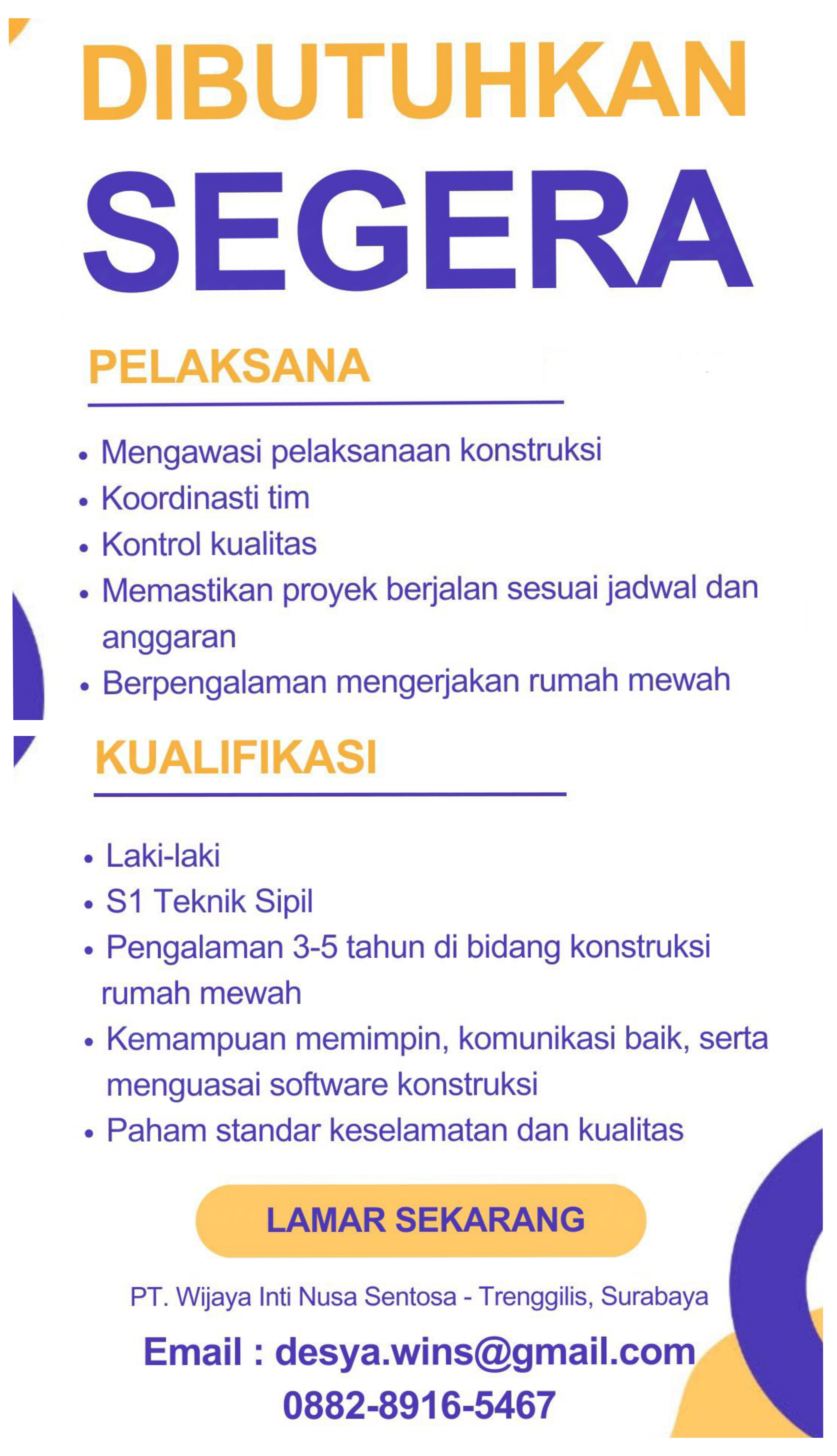Lowongan PelaksanaPT. Wijaya Inti Nusa SentosaLokasi : Tenggilis, Sura...