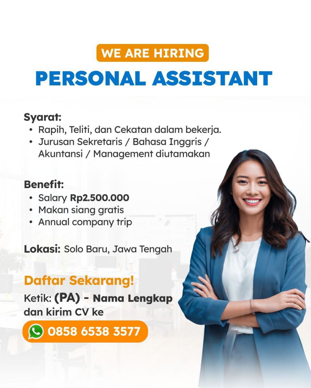 PERSONAL ASSISTANTSyarat:- Rapih, Teliti, dan Cekatan dalam bekerja.- ...